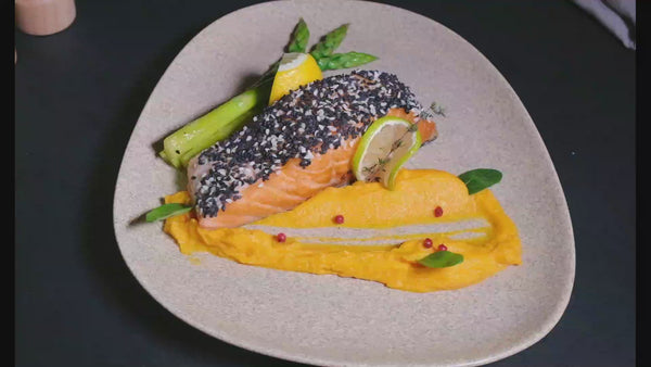 Somon în crustă de susan, sparanghel și piure de morcov