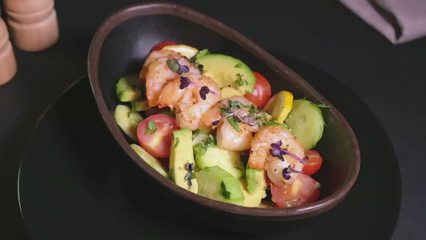 Ingrediente: avocado, roșii cherry, castraveți, creveți*, coriandru fresh, sare,dressing de lămaie