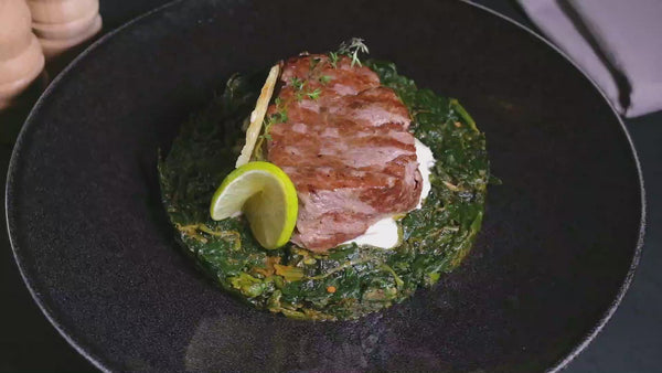 Ingrediente: mușchi de vită Argentina*, spanac*, smantana de gatit, vin alb sec, ulei floarea soarelui, sare, piper