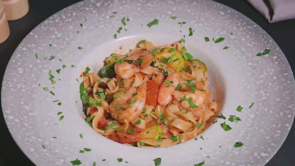 Ingrediente: paste tagliatelle, creveti* sos de Rosii, dovlecel, cherry, vin alb sec, usturoi, sare, piper, pătrunjel